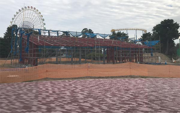 8月末に基礎工事が進んでいた華蔵寺公園・水生植物園内のカフェ建設現場。10月に入ってから鉄骨骨組みの組立工事が始まり、10日には完了していました。屋根形状は北に向かって下り勾配の「片流れ」型式。完成後を想像するに、店内の南側は広いガラス面、太陽光がタップリと射し込み、席からは水生植物園が一望でき、季節によっては店の外にもオープンカフェ。 園内散策や遊園地で遊んだ後、日々の散歩の途中で、家族や友人、恋人とのケーキ&コーヒータイムに、様々な人が立ち寄るでしょう。(2025/10/13 記) ![]() 工事が進むカフェ(南東側の園路から) 2025/10/10 ![]() 工事が進むカフェ(西側の駐車場から) 2025/10/10 ![]() 工事が進むカフェ(北西エントランスから) 。後方に観覧車とジェットコースター。2025/10/10 ![]() 鉄骨骨組みの組立を完了したカフェ(北側のスポーツロードから) 2025/10/10 基礎工事進む 2025/8/30掲載日:2025/8/31 ▲ページTopへ