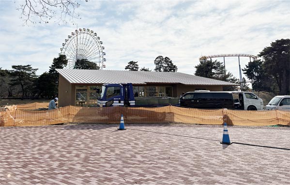 ![]() 片流れの大屋根。中央後方に観覧車、右後方にジェットコースター(園北西のエントランスから)。2025/11/22 |