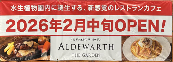 2月中旬オープン カフェレストランオープン日が気がかりだった華蔵寺公園・水生植物園内で建設が進むカフェ。年末には現場の2か所にオープン案内が掲示されました。1か所は施設西側に接する駐車場フェンスの北東角地でスポーツロードから見ることができます。もう一か所は施設南西の園路脇。案内によれば、オープンは2月中旬。キャッチコピーに「新感覚のレストランカフェ」とあり、案内にはステーキやパスタの写真も示されているので、食事もできるようです。 1月1日付発行の「市議会いせさき」にも当施設に関する一般質問の答弁記録が掲載され、それによると、「令和8年2月中旬のオープンに向けて進捗しており、営業時間は午前11時から午後10時まで、軽食などを販売する予定で・・・」とあります。(2026/1/2 記) ![]() 施設周囲に掲示されたオープン案内 2026/1/2 ![]() 全面ガラス張りのカフェを施設南西側から 2026/1/2 ![]() 工事終盤のカフェ(手前は水生植物園の水路)(施設の南側から) 2026/1/2 ![]() カフェ北東側のエントランス工事 2026/1/2 ![]() カフェ南西側の工事状況 2026/1/2 ![]() スポーツロード側に立てられた看板用メタルフレーム 2026/1/2 |