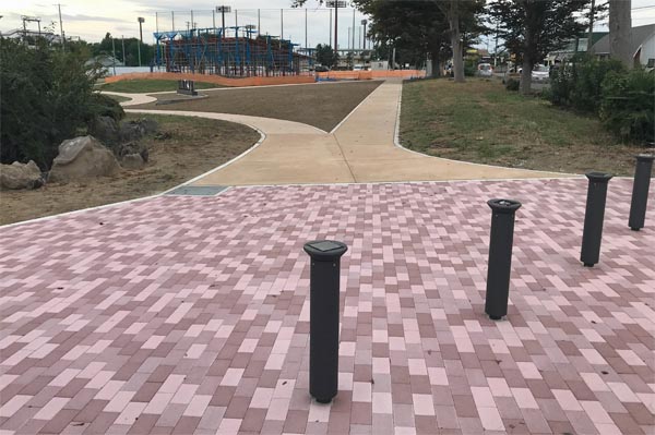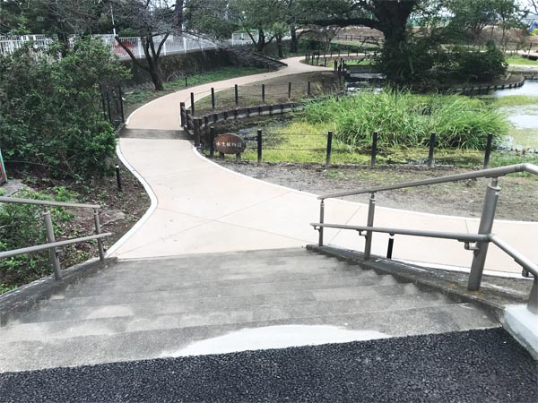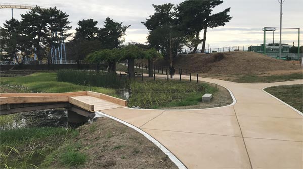水生植物園の園路では各所で改修工事が進んでいます。新しい園路は既存のアスファルト舗装を撤去し、両側に縁石を布設し、透水性高炉スラグ舗装を施工。雨天時に表面が雨水で濡れて滑り易くなることが低減できると思います。