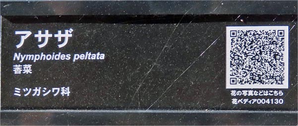 記) ●→「殖蓮地区自然環境を守る会」の皆さんが保護保全する男井戸川調整池ビオトープのアサザ 以下、Wikipediaから一部引用 アサザ(浅沙、阿佐佐、Nymphoides peltata (S.G.Gmel.) Kuntze):ミツガシワ科アサザ属の多年草。 浮葉性植物で地下茎を伸ばして生長。スイレンに似た切れ込みのある浮葉をつける。若葉は食用にされることもある。 夏から秋にかけて黄色の花を咲かせる。五枚ある花弁の周辺には細かい裂け目が多数ある。 環境省レッドデータブックの2007年改定により絶滅危惧II類(VU)から準絶滅危惧(NT)に変更。 ![]() 現地に立つ説明板 2025/11/22 ![]() 現地に立つ説明板 2025/11/22 |