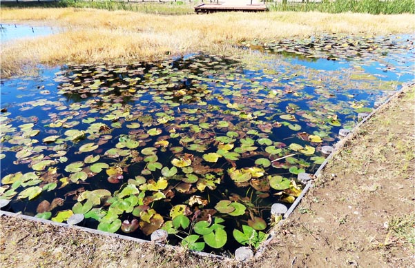 | 夏から秋にかけて黄色の花を咲かせるアサザ。日本では本州から九州などに生育し、全国的にその数は減少傾向のよう。ご当地伊勢崎市では、「殖蓮地区自然環境を守る会」の皆さんが男井戸川調整池ビオトープで保護保全活動を続けていますが、今回の華蔵寺公園 水生植物園の再整備事業において、アサザも植えられました。園内には2か所に植えられ、西側の藤棚近くの場所は「殖蓮地区自然環境を守る会」から寄贈されたようです。(2025/12/9