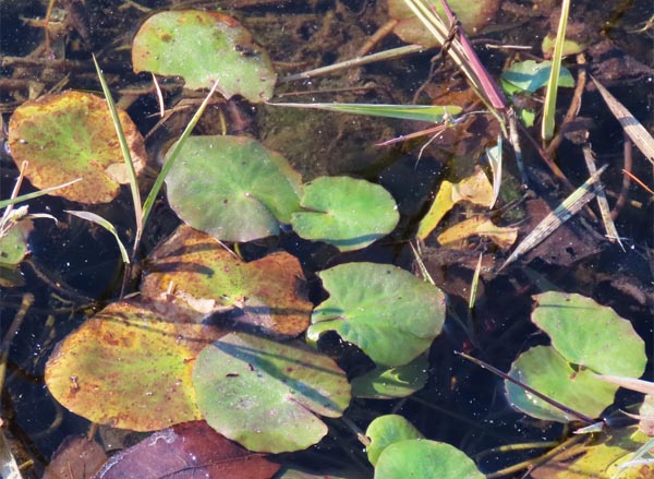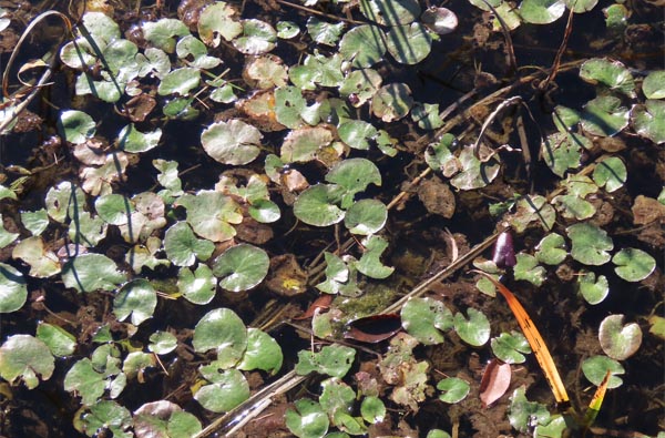 冬季のアサザの姿は睡蓮に似て、丸い葉が水面に浮いているだけ。通年の観察は今後の課題ですが、夏場の濃い緑に比べて少し茶褐色も混じるようです。来夏の開花期までどのように変化するのか、適宜観察したいと思います。(2025/12/9