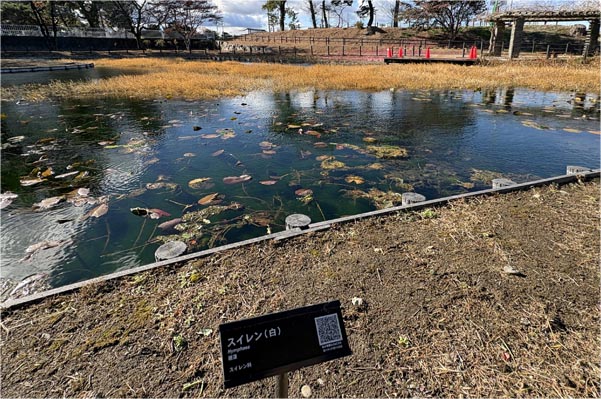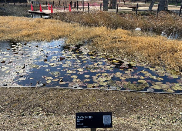 | 以下、Wikipediaから一部引用 スイレン(睡蓮) 学名:Nymphaea 【分類】 スイレン科、スイレン属 【特徴】 ・多年生の水草。 ・地下茎から長い葉柄を伸ばし、水面に浮水葉を浮かべる。 ・4枚の萼片と多数の花弁・雄しべ、1個の雌しべをもつ。 ・花弁の色は白色、黄色、赤色、紫色など。 ![]() 現地に立つ説明板 2025/12/26 |