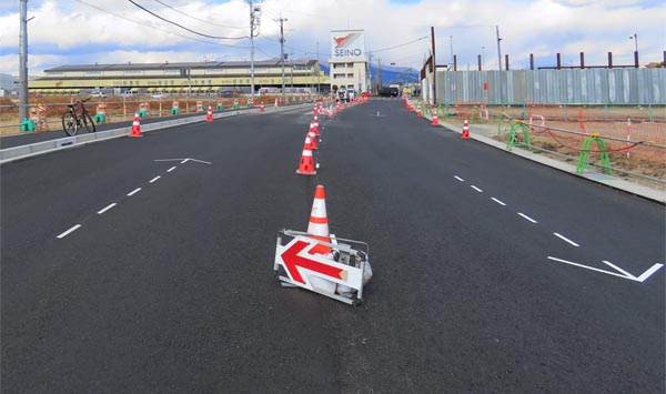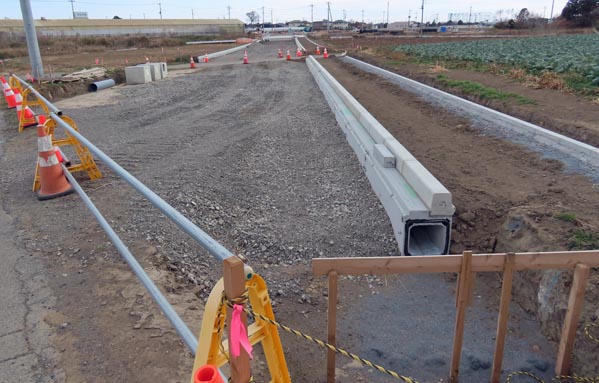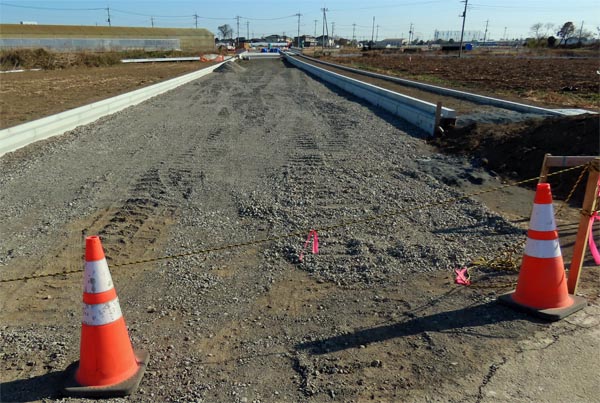 ・工区の東半分で下記工事が完了 ・両側の歩車道境界ブロック布設 ・東側歩車道境界には防護柵設置 ・車道は上層路盤工、歩道は路盤工 ・東側歩車道境界部は側溝布設 ・東側歩道外側に側溝布設 ・現道すり付け部に関して側溝布設、路盤工、雨水桝設置 工区西半分は基層路盤工(あるいは路床工)以降の工事は進んでいません。また東半分に関しても部分的な供用開始はありません。(2025/5/14 記) ![]() 工区中間部から東側(東側歩道と車道)2025/5/11 ![]() 工区中間部から東側(車道と西側歩道)2025/5/11 ![]() 現道から西方(上武道路方向)(西側歩道と車道)。右後方に赤城山。2025/5/11 ![]() 現道から西方(上武道路方向)(車道)。右後方に赤城山。2025/5/11 ![]() 現道から西方(上武道路方向)(車道と東側歩道)。右後方に赤城山。2025/5/11 ![]() 現道とのすり付け部(東側から西方)2025/5/11 |