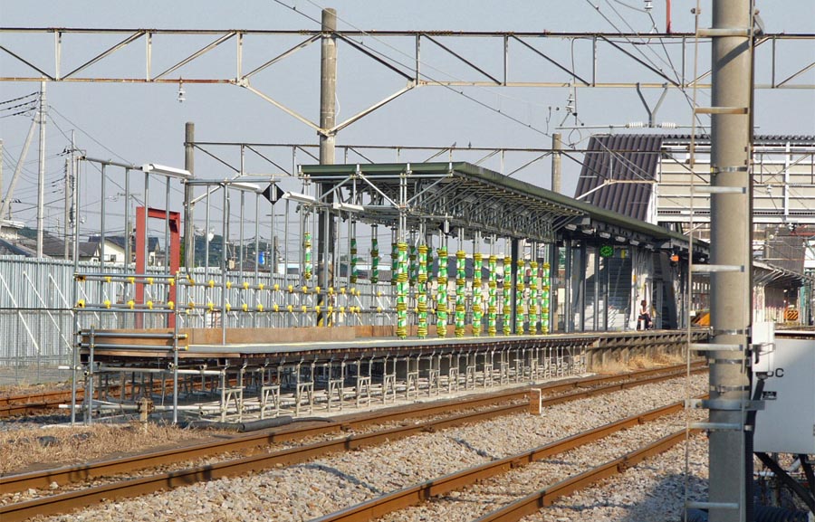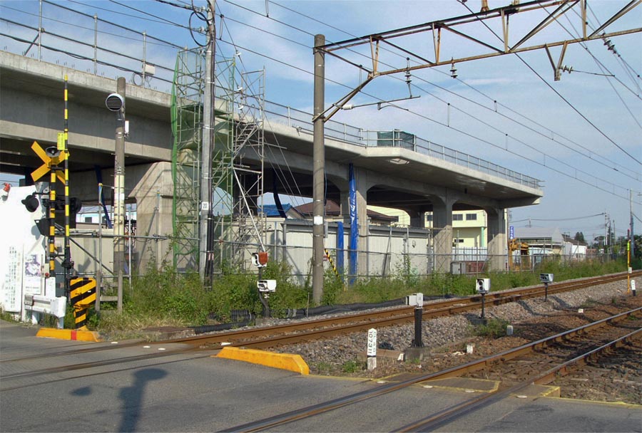 2007年10月、伊勢崎駅東方では、華蔵寺公園通りを挟む一部区間でJR両毛線の高架桁が完成。伊勢崎駅舎では、JR両毛線、東武伊勢崎線共に地上駅が現役。南北通路は北側階段桁が撤去され、跨線部の桁は残されています。両線共に電車は地上を走り、踏切や警報器も現役です。(2025/12/22