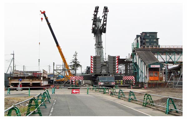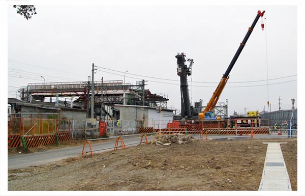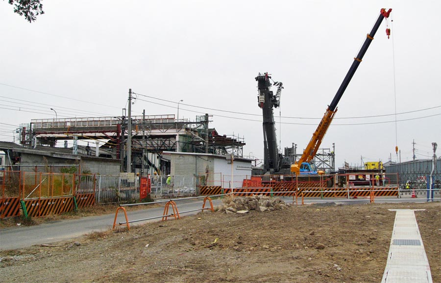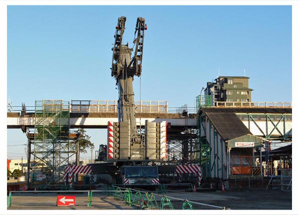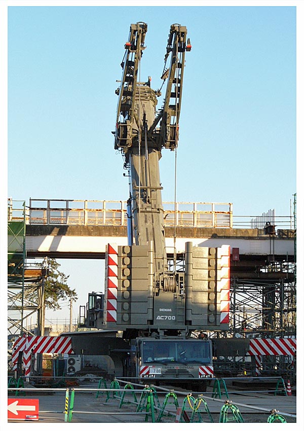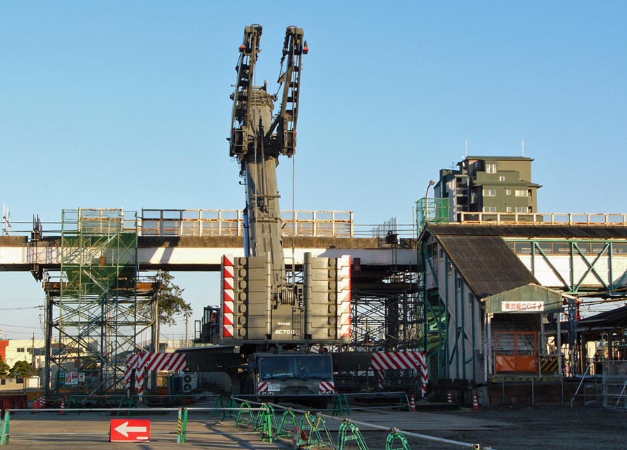 跨線橋の西側にクレーン設置DEMAG AC700TADANOが2019年、TEREXコーポレーションからDEMAG(デマグ)・モバイル・クレーン事業を買収。![]() 南北連絡跨線橋と桁吊り上げ撤去用クレーン 2007/11/23 ![]() クレーン本体の両側に幅広くアウトリガーを設置 2007/11/23 ![]() 両手を上げて咆哮するクレーン型トランスフォーマーのよう 2007/11/23 北半分の桁を撤去完了![]() 跨線橋の北半分を撤去。残るは南半分。 2007/11/27 ![]() 跨線橋の北半分を撤去。駅ホーム間の跨線橋は残っていますが閉鎖しています。2007/11/27 |