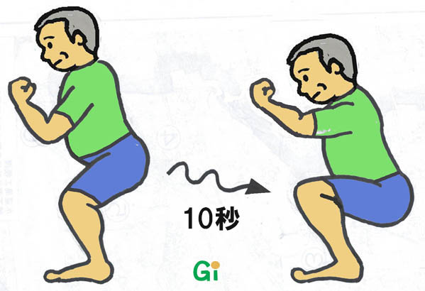 ▲ページTopへ (3)スロースクワット ← 血糖値を下げる10秒かけて、ゆっくり屈む。これを10回繰り返す。以上が1セット。少し休んで3セット。週2回。