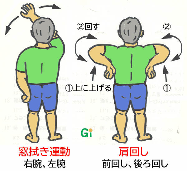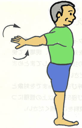 肘を脇腹に付けて・・・引く、回す![]() 肘を脇腹に付けて引く 肘を脇腹に付けて左右に回す 回数は痛みと相談して調整 |