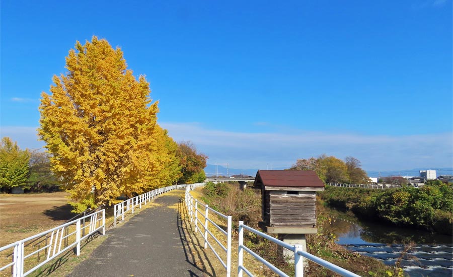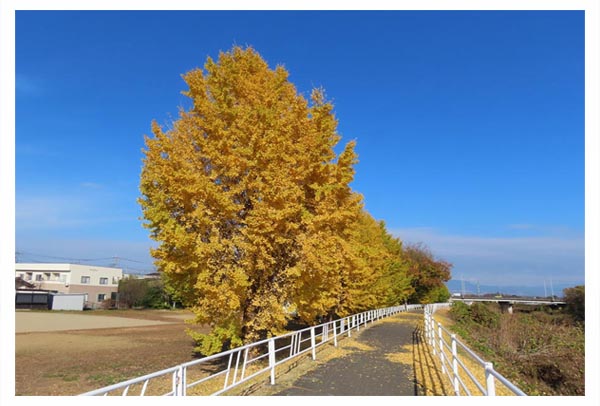 | 秋も深まり、テレビでは日本各地の黄葉便りが流れています。イチョウの定番は東京・神宮外苑のイチョウ並木。 ご当地伊勢崎市にも、公園や街路樹としてイチョウ並木は何か所もあり、当ページでもその一部を紹介しています。今回紹介するのは粕川右岸のイチョウ並木(伊勢崎市寿町)。堤防に沿った公園脇に立っています。すぐ南を東西に走る税務署通りを通過する車か、公園やサイクリングロード利用者でもない限り、なかなか気付かないような場所です。 ただ、西に公園広場、東に粕川が流れ、周囲に遮るものがなく、はるか後方には赤城山が横たわる、そんな場所に眩いばかりに黄葉するイチョウ並木は、わざわざ足を運ぶ価値があると思っています。(2025/11/29 記) |