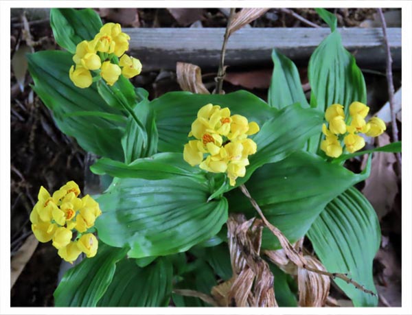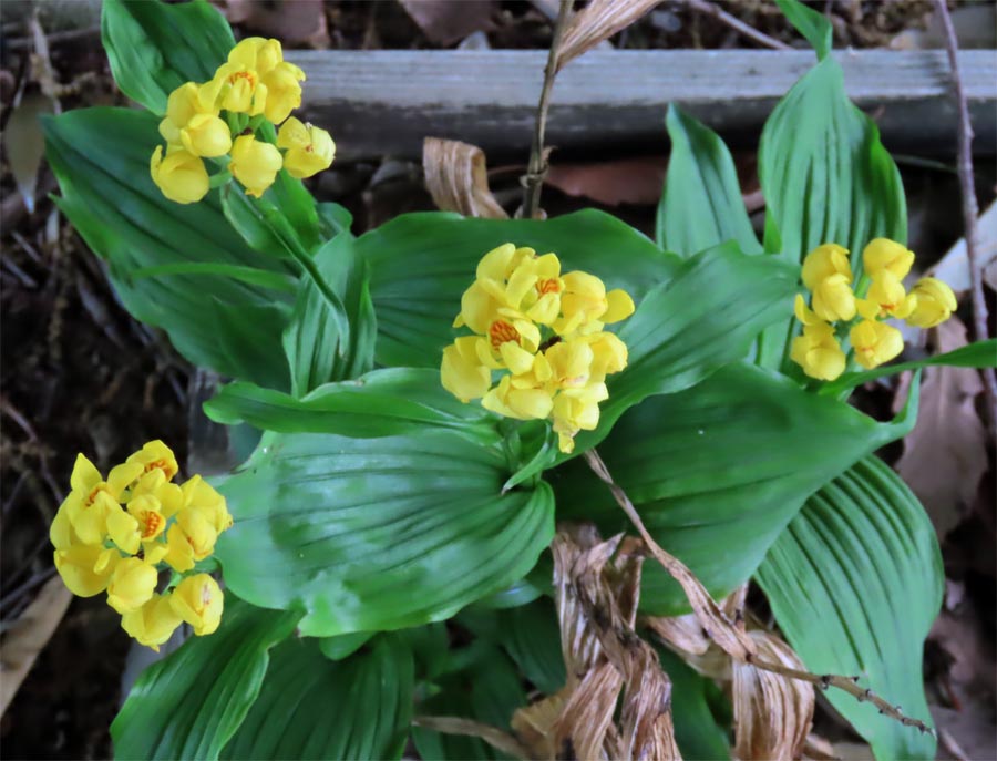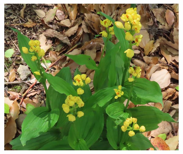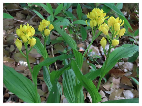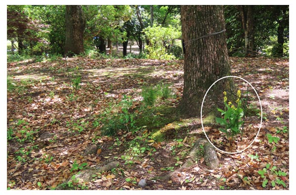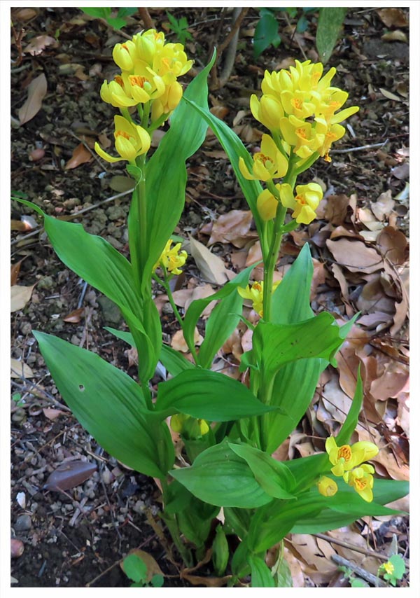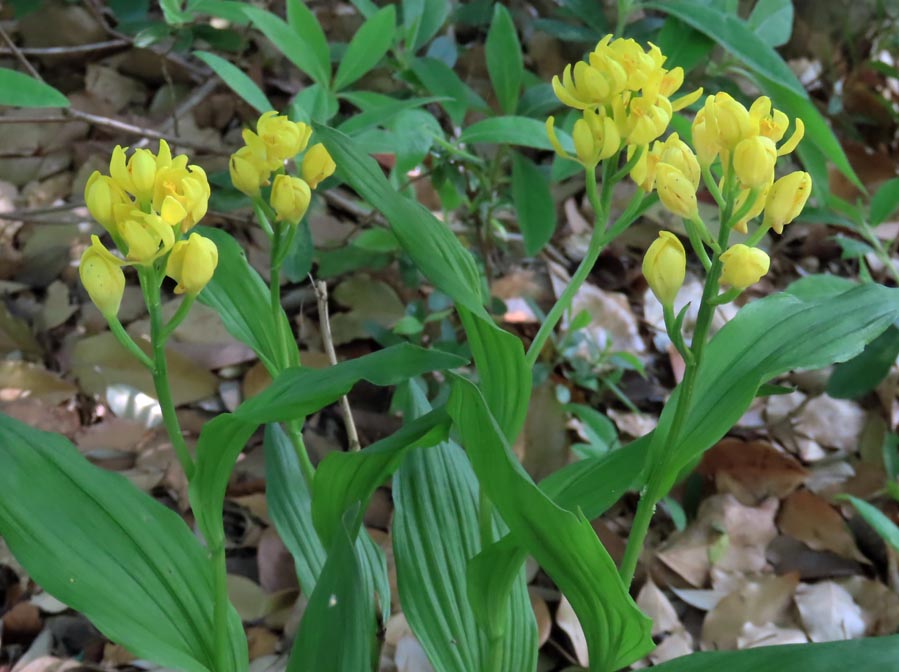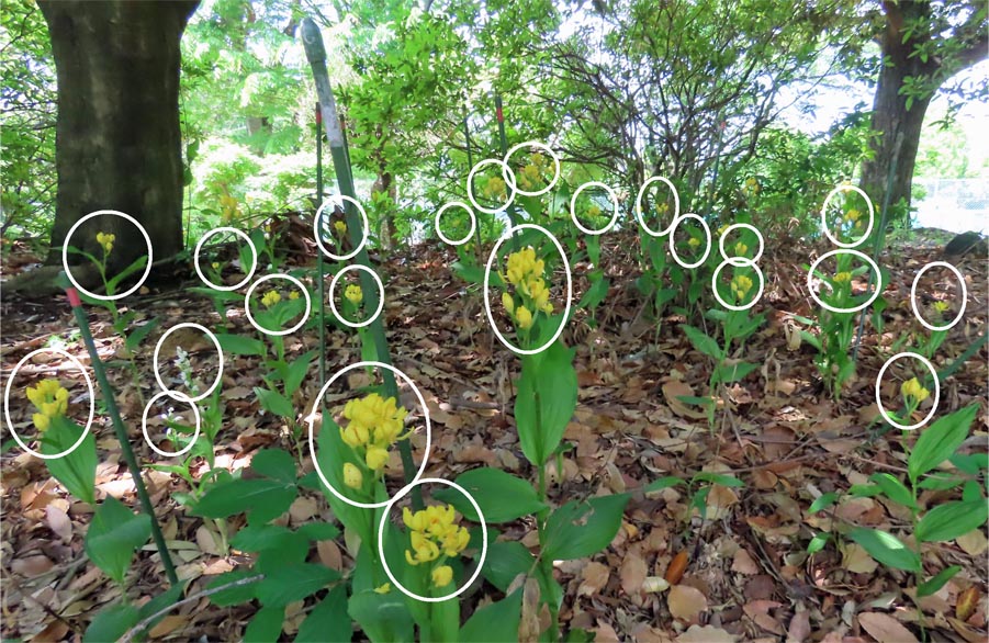 再調査三日のうち、最終日は5月7日。調査範囲はブロック13~16の4ブロック。 このうち、毎年多数のキンランとギンランを確認できるのはブロック15で、この傾向は今年も同じでした。他ブロックと異なる特徴は、キンラン群生地に菌根菌発生源と思われる大きな樹木がなく、胸高直径20cm程度の樹木が数メートル間隔で数本立っているだけ。 ブロック13は全16ブロックの中で最大面積ですが、範囲が広い割には確認できる株数は少なく、キンラン4株、ギンラン0株でした。ブロック13の大半は一日中密生した常緑樹に覆われて日射が乏しく、かつ地面には枯葉が厚く堆積していて、この区域で確認できたキンランは1株だけでした。半日陰でも咲くキンランですが、一日中日射を閉ざされ落ち葉が厚く堆積した場所では生育が難しいようです。(2025/10/2 記) ![]() 群生して咲くキンラン 2025/5/7 キンランが咲く場所 2025/5/7 |