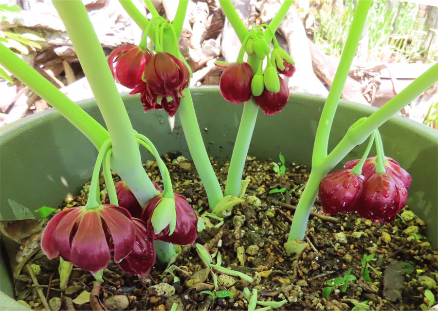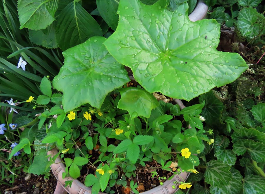 2025の今年、このうち円形の33cmの鉢からは無事に発芽し、昨年にも勝る大きさに成長しましたが、正方形の33cmの鉢からは一つも発芽せず、発芽時期から一か月後、鉢の土をほぐしてみると、中には全く何もありませんでした。根っ子の残骸さえもありませんでした。 ![]() 生き延びて元気に成長した鉢植えと死滅した鉢植え。その差は何だったのでしょう。 病気や害虫? 凍結や遅霜? 2鉢を1mほど離れた距離に置き、使用した土は同じ(自家製腐葉土)、施肥や水あげも同じ、気温と日射量もほぼ同じだったはず。原因は謎です。 残る1つ、内径22cmの寄せ植えは今年も発芽し、ほかの山野草と共に元気な姿を見せてくれました。寄せ植えするには22cmでは小さ過ぎるので、開花中に辺長33cmの鉢に丸ごと移植しました。 残る2鉢のハッカクレン。絶やさないように今年は増殖に挑戦しようと思います。 【ハッカクレンの移植や種蒔き】 ■植え付け、植え替え・・・・10月下旬から11月いっぱい 鉢から抜いて根をほぐす。ゆったり入る鉢に根を広げ、芽を2cm前後覆土する。 増えた株は株分けする。長く太い根はカットして1cmほど覆土する。 ■とりまき(*1)・・・・・11月中 (*1):採取した種子を、保管しないですぐに蒔くこと。「採ったらすぐに蒔く」ので「採りまき」。山野草や野生種・樹木のタネは、概して「採りまき」をすべきものが多いよう。 内径33cmの鉢のハッカクレンすべて開花、落花もはじまる 2025/5/10![]() 赤紫色のハッカクレンの花がほぼ全て開花しました。 今年の11月には「とりまき(採り蒔き)」に挑戦予定。2025/5/10 ![]() 昨年、大胆に庭木を強剪定したので、今年は日陰が少ないのが心配。2025/5/10 大きな葉っぱの長さは35cm![]() 大きな葉っぱの長さは35cm 2025/5/10 2025/5/3![]() 日陰づくりのため、隣にコナラの鉢植えを置きました 2025/5/3 ![]() ハッカクレンの名前の由来、8つの角が分かります。2025/5/3 ![]() 花をアップで撮りましたが下向きなので雄しべ、雌しべの様子は分かりません。2025/5/3 ![]() 何ともユニークなハッカクレンの花 2025/5/3 ![]() まだ蕾がいくつか残っています。全部開花するのは一週間後辺り? 2025/5/3 2025/4/22![]() 開花が始まりました 2025/4/22 ![]() 葉っぱが大分成長しました 2025/4/22 ▲ページTopへ 寄せ植えしたハッカクレンミツバツチグリとミヤコワスレと一緒に寄せ植え大きな鉢に移植 2025/5/3![]() 一回り大きな鉢(辺長33cm)に移植しました 2025/5/3 2025/4/21![]() 野の風情がいい感じです 2025/4/21 |