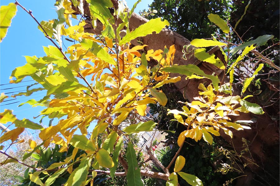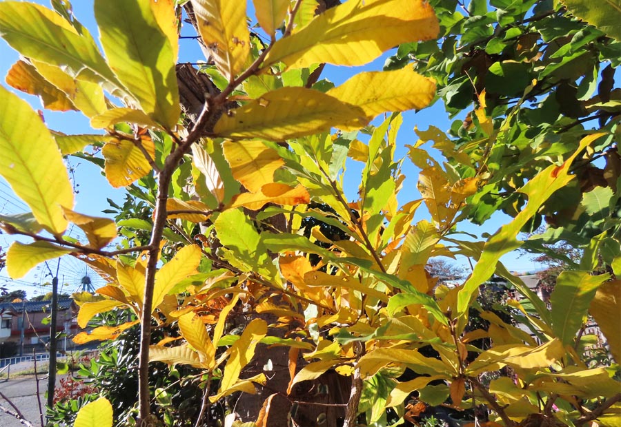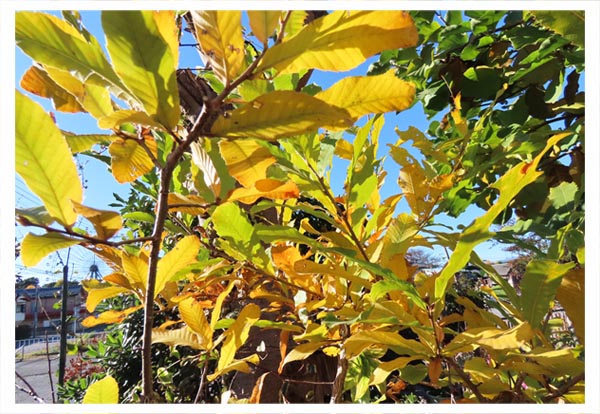 庭の鉢植えのコナラの黄葉が茶色に変化する頃、出番を待っていたかのようにクヌギの黄葉が進みます。こちらも鉢植え。正確には覚えていませんが、ドングリを埋めてから10年ほど経っていると思います。現在の樹高は1.35mですが、鉢植えのせいかここ数年はそれほど伸びていません。黄葉した葉を太陽光越しに見ると、コナラに比べてより透き通った感じがします。黄葉の色もコナラは黄土色に近いですが、クヌギはより黄色に近いように思います。 ここ数年、目の悪化で行動範囲が狭まっていて、登山やハイキング機会が激減していますが、家に居ながらにして楽しめる黄葉、今後ますます大切な存在になりそうです。(2025/11/23 記) ![]() 黄葉の背景には青空が似合います。後ろには常緑樹の柚子。 2025/11/3 ![]() 太陽光を受けて、まばゆいばかりに輝くクヌギの黄葉 2025/11/22 ![]() クヌギ、黄葉真っ盛り。隣のモクレンはまだ緑の葉で覆われています。 2025/11/22 |