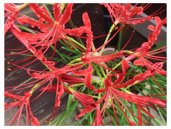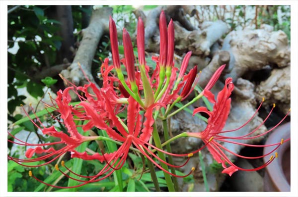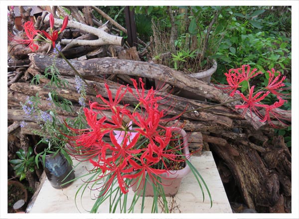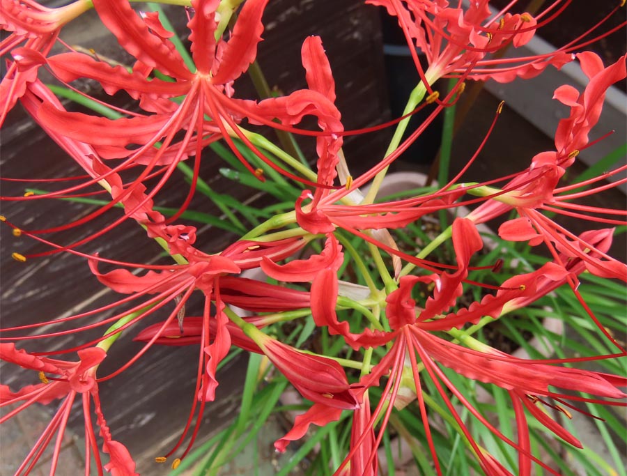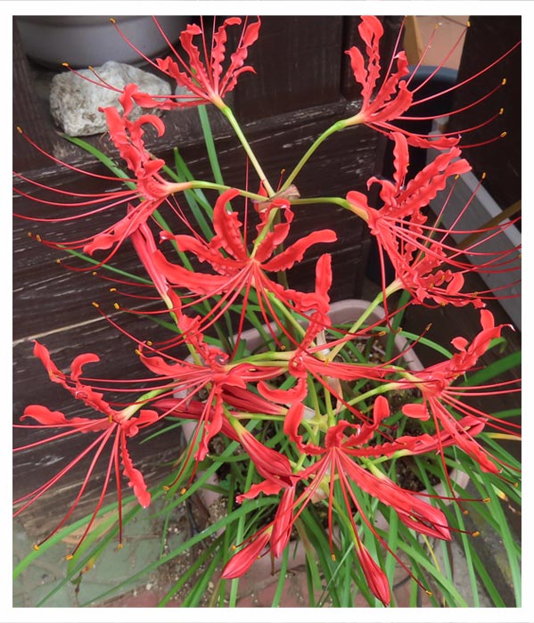 全国的に猛暑日が続いた2025年の夏。ご当地伊勢崎市では9月17日に35.9度、18日に35.5度と、9月中旬を過ぎてもまだ猛暑日となりました。 秋の涼しさを知ってから咲く彼岸花属の花たち。郊外では、早い年には9月に入って間もなく咲き始めます。今年の状況は確認していませんが、我が家ではリコリスが咲き始めました。 ![]() リコリスには数十種類あるようですが、このリコリスの種類は不明です。全体的に普通の赤い彼岸花に似ていますが、茎の長さと花の大きさが少し小ぶりで、花弁の幅が細く、捻じれています。 色が赤系統なことから、リコリスジャクソニアナと仮定して調べましたが、ジャクソニアナは色がピンクがかっていて、花弁も細くはなく、捻じれてもいません。このリコリスの種類は一体何なんでしょう。 難しい話はさて置いて、我が家の庭で咲いた赤いリコリスをご覧ください。(2025/9/20 記) 鉢植えの開花は地植えの一週間遅れ![]() 二手に分かれた赤いリコリス。葉は同居する玉すだれの葉。 2025/9/15 ![]() 赤いリコリス、満開。 2025/9/15 ![]() 細く捻じれた花弁が特徴的です 2025/9/15 先に咲いたのは地植え![]() 半分蕾、半分開花、地植えの赤いリコリス。2025/9/9 ![]() ほっそりとして捻じれた花弁、どこか涼やかです。 2025/9/9 |