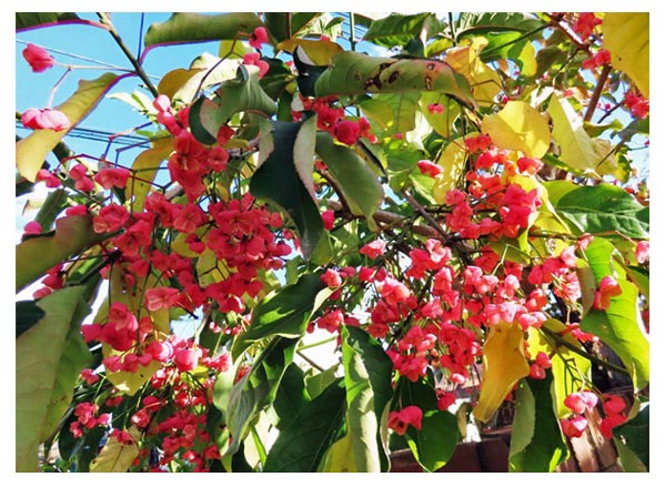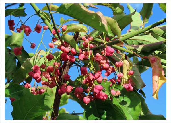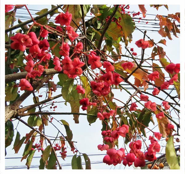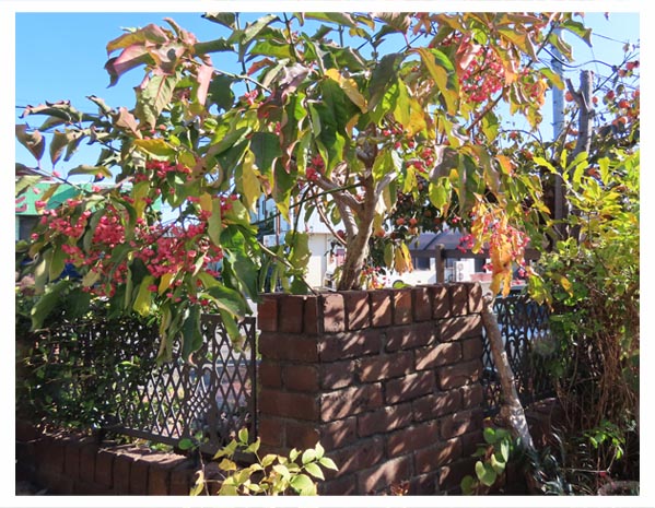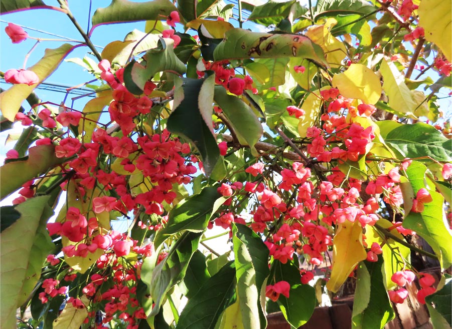 我が家のマユミの葉はほぼ黄葉、ごく僅かに紅葉します。葉の大きさは、マンサクやナツツバキより大きく、ハナズオウと同等、モクレンより小さ目です。黄葉して落葉してもモクレンのようにカラカラに乾燥せず、シットリしています。拾い集めて腐葉土の材料にします。![]() これが全体の姿。根はレンガブロック塀の向こう側に張っています。2025/11/19 ![]() 黄葉が徐々に進み、彩りが加わりました。2025/11/18 ![]() 太陽光を受けると、より一層黄葉が映えます。2025/11/15 ![]() 弾ける前の実 2025/11/15 |