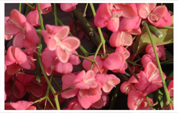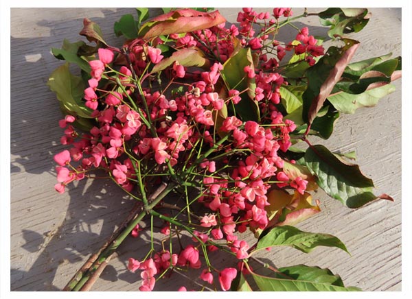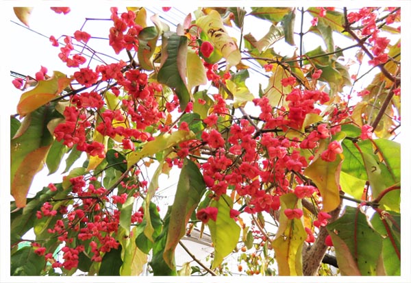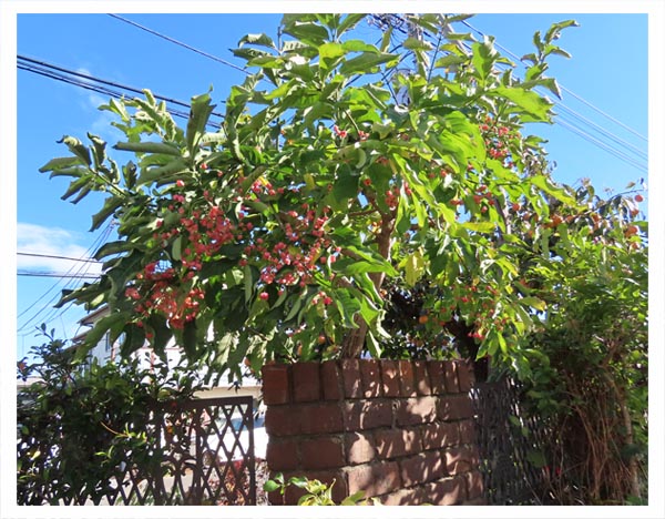 | 我が家には野鳥が飛来します。ヒヨドリやオナガ、キジバト、メジロ、コゲラ、スズメ等です。珍しいところでは、アオゲラやジョウビタキが飛来したこともあります。一休みする庭木があるためと思いますが、近くに華蔵寺公園があるので、公園に来たついでに立ち寄るのかも知れません。 野鳥がやって来ると、楽しみな出来事があります。野鳥がどこかで食べた木の実を、糞に混ぜて庭に落とし、それが発芽して育つことです。我が家のマンリョウは全て野鳥のお土産です。ほかにシャリンバイや南天、サンショウ、名前不明の樫のような常緑樹、種で運ばれるのか不明ながら欅や榎などです。欅や榎、樫の類は放置して置くと、後で伐根するのに苦労するので、目に留まる大きさに育つと、除去したり鉢に移植したりしています。 ![]() ここで紹介するマユミは、我が家では初登場です。発芽した場所がレンガブロック塀脇で目立たない場所だったので、気が付いた時には既に50cmほどに成長していました。7、8年前だったと思います。気付いてから4、5年は樹種不明のまま様子を見ていましたが、葉が大きくシッカリした形だったので「きっと名のある木に違いない」とは思っていました。 マユミと分かったのは3年前。春に白い小さな花をたくさん咲かせ、その後結実したからです。 マユミとの初対面は伊与久沼公園(伊勢崎市境伊与久)。当サイトを開設した2006年9月の2か月後、2006年11月23日です。朱色の小さな実をたくさん付けた姿が印象的で、いつか庭に植えたいと思いつつ、植木屋さんに出かけることもなく年月が過ぎていました。 そんな折だったので、マユミと分かった時にはちょっと得した気分になりました。ところが一昨年と昨年は、秋に真っ赤に結実する姿を楽しみにしていたところ、夏ごろまでに何者かに全ての実を食べられてしまいました。まだ緑色の柔らかい状態です。現場を見ていないので犯人は特定できませんが、野鳥か昆虫でしょうか。マユミはニシキギ科で、ニシキギはカメムシの好物なので、カメムシでもいたでしょうか。姿は確認していませんが。 そんな残念な気持ちで迎えた今年、「今年もまた秋前に食べられてしまうのだろう」と、覚悟しながら様子を見ていると、夏が来て、夏が去り、秋が来て秋が深まる今になっても、一向に食べられる様子がありません。 理由を考えるに、昨年までは開花し結実した量がごく僅かで、今年はその優に一桁倍以上結実したので、野鳥?も昆虫?もその多さに圧倒されたのでしょう。単にほかに食べ物があったせいかも知れませんが。ただ、思い出すに、開花時に花に向かってフマキラーを2、3回吹き付けました。その効果かも知れません。 鳥がプレゼントしてくれたマユミ。何はともあれ、今年初めて真っ赤にタップリと結実しましたのでご覧ください。(2025/11/27 記) ![]() マユミ・黄葉した葉と朱色の実 2025/11/27 ![]() 2025/11/27 ![]() 弾けると四つ葉のような形になるマユミの実 2025/11/27 ![]() 鳥に食べられる前に切り取り、ドライフラワーに。2025/11/27 ![]() 黄葉して落葉したマユミの葉 2025/11/27 |