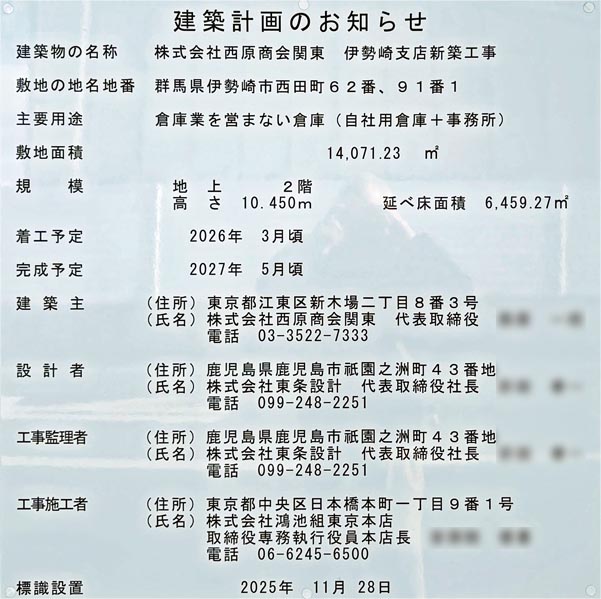 | 以下、現地掲示の「建築計画のお知らせ」から ・名称:株式会社西原商会関東 伊勢崎支店 新築工事 ・住所:伊勢崎市西田町62番、91番1 ・主要用途:倉庫業を営まない倉庫(自社用倉庫+事務所) ・敷地面積:14,071.23u ・規模:地上2階、高さ10.45m、延べ面積6459.27u ・着工予定:2026年3月頃 ・完成予定:2027年5月頃 ・標識設置:2025年11月28日 ![]() 現地に立つ建築計画のお知らせ。個人名はプライバシー保護のためにぼかしました。 |