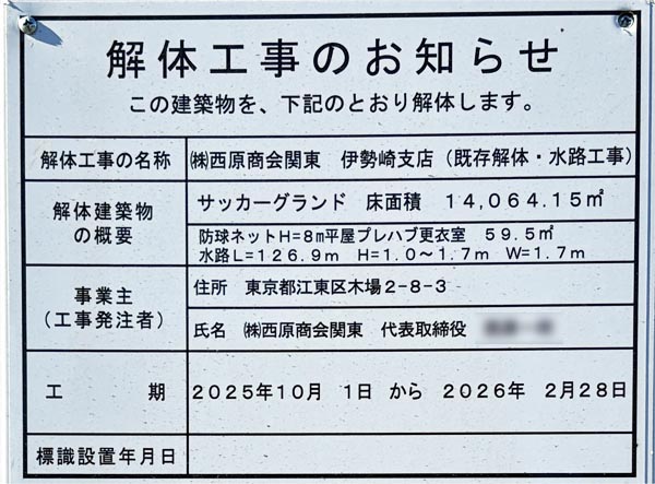 | サンデン株式会社が創業地群馬県伊勢崎市寿町の本社工場を赤城事業所(サンデンフォレスト、前橋市粕川町)へ移転し、残された工場施設はサンデングローバルセンター(SGCT)や駐車場に変わりました。 ここサンデンフットボールパークはその跡地利用の一つ。2008年3月には安全祈願祭が行われ(→サンデンフットボールパーク 安全祈願祭)、以来、ザスパクサツ群馬の練習場として、また近隣のサッカーチームの競技場として利用されて来ました。今回、18年の歴史にピリオドを打ち、新たに西原商会関東 伊勢崎支店が建設されることになりました。 株式会社西原商会は、昭和46年12月、鹿児島市で創業した業務用総合食品卸の会社。日本国内のみならず世界にも事業所を設け、北関東3県にはそれぞれ営業所があり、群馬県内には群馬伊勢崎営業所(伊勢崎市富塚町)があります。 今回の事業名は「伊勢崎支店 新築工事」とあるので、営業所から格上げの事業所になるようです。建物の用途は倉庫業を営まない倉庫(自社用倉庫+事務所)。工事会社は鴻池組(本社:大阪府大阪市)、完成予定は2027年5月頃です。(2025/12/29 記) ![]() 工事用出入り口脇に掲示された建築関連諸票 2025/12/26 下記は同社ウェブサイトを参照しました 商号:株式会社 西原商会 事業内容:業務用総合食品卸(ホテル、レストラン、結婚式場、料亭、居酒屋等への食品卸売) 創立:昭和46年12月 資本金:5,000万円 従業員数:2,365名 2025年4月現在(グループ合計) 売上高:(グループ連結)1,281億円(2025年2月期) ・ ・ ・ ・ ・ ・ 創業地:鹿児島県鹿児島市紫原 本社所在地:〒890-0062 鹿児島県鹿児島市与次郎一丁目10番21号 |