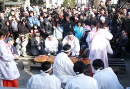 ![]() こんがりと美味しそうに焼けた 直径55cmの大串まんじゅう。 1つで普通サイズの300個分とのこと。 参拝者や見物の人たちに「福分け」としてお裾分けがありました。 2009/1/11 |
