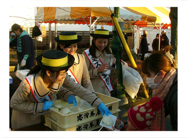 ![]() あんこ入り焼きまんじゅうを配るミスひまわりさん3人。ハイ、どうぞ。ありがとう〜♪ 2013/1/11 |