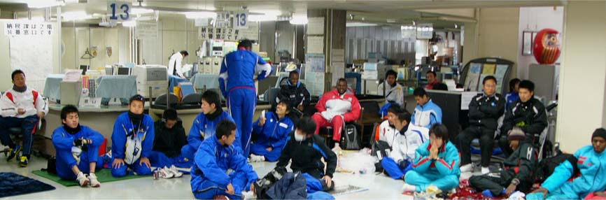 伊勢崎市役所1Fホールが選手控え室として開放され、各チームが2区の選手のゴールを待っていました。ホール中央には大きなテレビ画面があり、刻々と現在の状況を伝えています。待っている選手達の間から緊張感が伝わって来ます。![]() 中央の大型テレビ画面が レースの状況を伝えています ![]() |