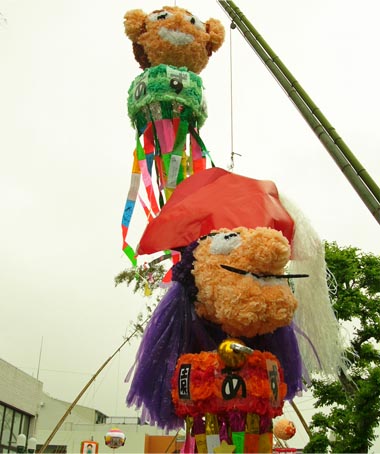 ![]() (23) 吹き流しを飾る蓮や扇子。 黒い折り鶴はかぐや姫を育て 送り出す老夫婦とのこと。 |