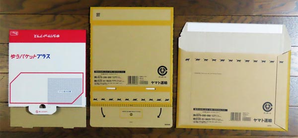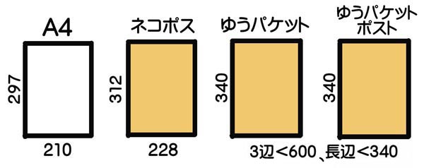 *5:必ず専用封筒が必要です。封筒は厚みを持たない(マチがない)タイプなので、厚みのある本などを梱包する場合、厚さも幅を狭めます。内寸は公称で16.8×21.1cmですが、体験では、CD(ケース付き)や3cm以下の文庫本等は無理なく梱包できますが、例えば厚さ1.5cmの本の場合、13×19cmがギリギリのサイズです。 *6:梱包後の形状がポストに入る大きさ。物品自身が3cm以下でも、緩衝材で包む必要がある場合、要注意です。 ![]() 「ゆうパケットポストmini」の専用封筒 ![]() 「ゆうパケットポストmini」の専用封筒に、厚みがある本を梱包した場合。 サイズが「ゆうパケットポストmini」に入らず、梱包後の厚さが3cm以内、サイズがA4以内ならば、次の候補は料金が安い順に「ネコポス」、「ゆうパケットポスト」、「ゆうパケット」の3方法です。 まず、「ネコポス」は他の2方法に比べてサイズ制限が僅かに厳しく、この差で候補から外れる場合があります。具体的には楽譜や図鑑では、横幅がA4の210mmより広い場合があり、物品をOPP袋や緩衝材で包むと制限を超えます。 ![]() ![]() 次の候補「ゆうパケット」と「ゆうパケットポスト」は”3辺合計<60cm”と、サイズの融通が利きます。 例えば、上図の楽譜(厚さ1cm)を発送する場合、梱包による増加を3辺それぞれ1cmとすれば 30.3+22.5+1+3×1=56.8cm < 60cm と、制限をクリアできます。 「ゆうパケット」と「ゆうパケットポスト」の特徴を下記に示します。