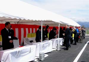 ![]() 式典の受付。 波志江PAスマートインターの建設に携わった 伊勢崎市建設部の皆さんが総出で対応 ![]() 式典会場の入口 2008/3/29 |