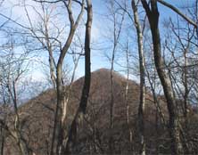 舟石峠から20分位入った所からの備前楯山の全貌 途中の登山道のカラ松林。一部急な登りもあるが、全体的によく整備されて登りやすい。 |