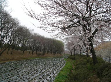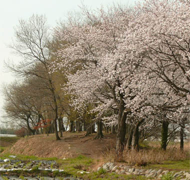 | 6月には国指定史跡「女堀」をたくさんの花しょうぶが埋め、市内外、県内外から大勢の花見客が訪れる赤堀花しょうぶ園。でも、その季節を除くとなかなか訪問者の姿を見かけず、桜の季節においても例外ではないようです。 2015年4月4日、桜がまだまだ見ごろの土曜日、小雨が上がったばかりのすぐれない天候のせいもあってか、園内を一回り散策した1時間の間、出会った花見客は二人だけでした。周囲に人家が少なく、まだ自然さが残る赤堀花しょうぶ園。弓型に大きくカーブした「女堀」と、小高い土塁から静かに眺めた桜、申し訳ないほどに贅沢なひと時でした。(2015/4/7 記) |