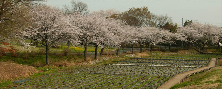 ![]() 花しょうぶ園の中央から北側にかけて、しょうぶ園を囲むように咲くサクラ並木 2013/4/1 |