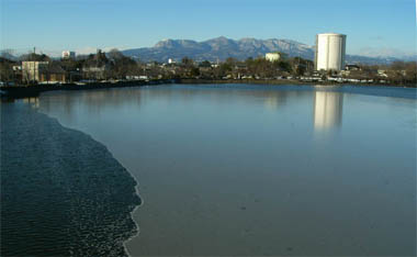 ![]() シャーベット状の固まり切らぬ氷が湖面を覆い、その真ん中にできた水路(園路橋から南方)。 2014/2/23 |
