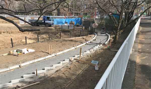 園路幅員は標準断面が縁石外側間隔で2.0m。個人的には2.5mか3.0m程度は欲しいと思っていましたが、限られた園内スペースと予算の関係もあるでしょうから、仕方ありません。以下に園内各所の園路改修工事の3月28日の状況を示します。(2025/4/2 記) 園の中央部![]() 画像中央の白い縁石が布設された場所が園路 2025/3/28 園の西側![]() 2025/3/28 園の西側(藤棚の西)![]() 2025/3/28 園の西側(藤棚の南)![]() 2025/3/28 園の南西側![]() 後方左端に観覧車、中央右にジェットコースター 2025/3/28 ![]() 園の南西側の曲線部 2025/3/18 園の南側![]() 園の南側(縁石布設完了) 2025/2/24 ![]() 園の南側(路盤工と縁石布設) 2025/2/7 |