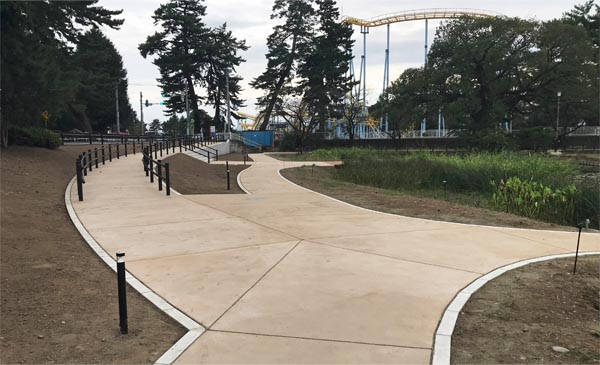 現場ではインターロッキング舗装と車止め設置を終えています。エントランスの舗装は、工事前からあった巨木(欅のようです)を残し、これを避けた小さな歩道も作られていて、洒落た雰囲気です。 西側に隣接する駐車場との境界に沿って、南北方向の道路状区画があり、7月5日時点では未舗装でした。作業用車両の出入り用通路と思われます。工事設計書では車止め数量は8本ですが、インターロッキング舗装部に設置されたのは5本です。残り3本の設置場所は未確認ですが、この通路用かも知れません。正解は次回紹介時に。(2025/7/7 記) ![]() 北西角地の大きな木(欅?)を残して作られたエントランス 2025/7/5 ![]() 北西エントランスと西側に隣接する駐車場との境界 2025/7/5 ![]() 巨木の東側の歩道。またスポーツロードの防護網フェンスが残っています。2025/7/5 ![]() インターロッキング舗装と車止め設置を終えた北西エントランス。 左側はスポーツロード。後方に観覧車「ひまわり」 カフェ建設地と思われる場所には、まだ工事着工の動きは確認できません。2025/7/5 ![]() 西側に隣接する駐車場との境界(北から南方)。境界に沿った道路状区間は未舗装。 左後方に観覧車「ひまわり」、中央後方にジェットコースター。2025/7/5 ![]() 西側に隣接する駐車場との境界(南から北方) 2025/7/5 ![]() 西側に隣接する駐車場と接続する遊歩道 2025/7/5 縁石布設、路盤工施工 2025/4/6![]() 北西エントランスから園内(南東)方向 2025/4/6 ![]() 元市民プール跡地駐車場との境界 2025/4/6 2025/3/28![]() 元市民プール跡地駐車場との境界 2025/3/28 側溝布設 2025/3/18![]() 北西エントランスから園内(南東)方向 2025/3/18 ![]() 元市民プール跡地駐車場との境界 2025/3/18 工事着工前 2025/1/2![]() 工事着工前 2025/1/2 |