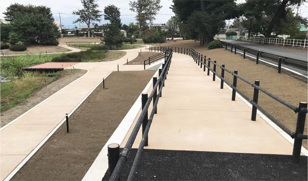 水生植物園の園路では各所で改修工事が進んでいます。新しい園路は既存のアスファルト舗装を撤去し、両側に縁石を布設し、透水性高炉スラグ舗装を施工。雨天時に表面が雨水で濡れて滑り易くなることが低減できると思います。