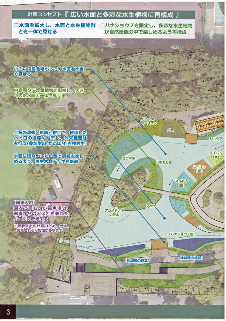 説明会に先立って、臂伊勢崎市長さんが『はな咲く。』プロジェクトや再整備計画の意義や位置付けを説明。続いて設計会社職員さんの全体説明の後、参加者を2グループに分けて水生植物園内を回りながら説明や質疑応答を実施。 設計業務は今年6月に発注され、10月31には完了(*3)。この日の説明会で、説明用資料として設計概略図や植栽予定の植物の参考図等(A4カラー折り全8ページ)(*4)が配布されました。 整備計画によれば、新しい水生植物園にはミソハギやコウホネ、アサザ、ガマ、トチカガミ、スイレン等の水生植物が植えられる予定で、今まで花しょうぶが主体だった当植物園が植物の多様性を見せてくれる植物園に生まれ変わるようです。