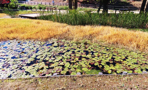 | 夏から秋にかけて黄色の花を咲かせるアサザ。日本では本州から九州などに生育し、全国的にその数は減少傾向のよう。ご当地伊勢崎市では、「殖蓮地区自然環境を守る会」の皆さんが男井戸川調整池ビオトープで保護保全活動を続けていますが、今回の華蔵寺公園 水生植物園の再整備事業において、アサザも植えられました。園内には2か所に植えられ、西側の藤棚近くの場所は「殖蓮地区自然環境を守る会」から寄贈されたようです。(2025/12/9