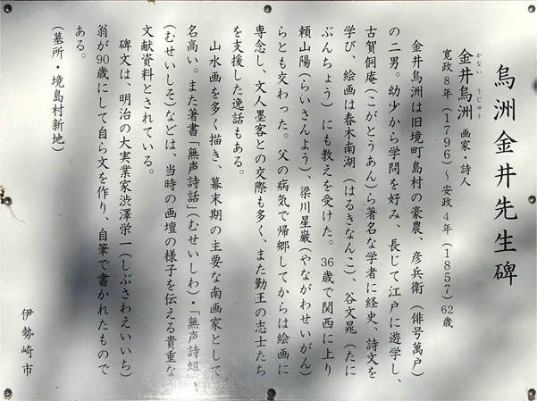 ![]() 烏州金井先生碑(石碑の上部)2021/2/23 ![]() 烏州金井先生碑(石碑が建つ場所)2021/2/23 ![]() 烏州金井先生碑と説明板。左後方が華蔵寺山山頂。 2021/2/23 ![]() 烏州金井先生碑(現地説明板) 2021/2/23 |