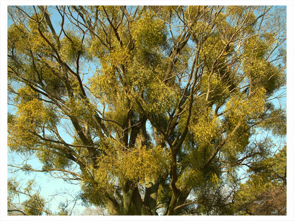 | ■以下はWikipediaの記事の一部引用です■ ヤドリギ:ヨーロッパおよび西部・南部アジア原産。半寄生の灌木で、他の樹木の枝の上に生育する。30〜100cmほどの長さの叉状に分枝した枝を持つ。黄色みを帯びた緑色の葉は1組ずつ対をなし、革のような質感で、長さ2〜8センチメートル、幅0.8〜2.5cmほどの大きさのものが全体にわたってついている。花はあまり目立たない黄緑色で、直径2〜3cm程度である。果実は白または黄色の液果であり、数個の種子が非常に粘着質なにかわ状の繊維に包まれている。全体としては、半ば宿主の枝から垂れ下がって、団塊状の株を形成する。宿主が落葉すると、この形が遠くからでも見て取れるようになる。 |