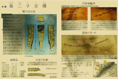 | 形式、規模:墳丘長38メートルの前方後円墳。後円部径30m、高さ5m、前方部幅18m 築造年代:6世紀後半 埋葬施設:横穴式石室 出土品:円筒埴輪、形象埴輪、須恵器、土師器、武器、装身具 1927年4月8日、「後二子古墳ならびに小古墳」として国指定史跡。 |