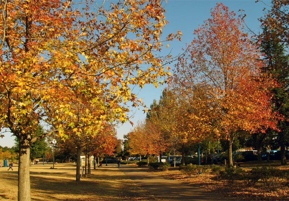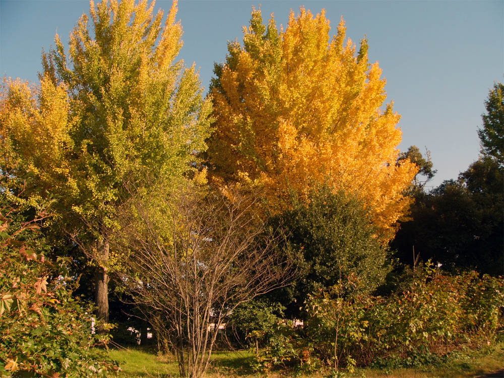 ![]() 紅葉した楓が並ぶ遊歩道 2014/11/16 ![]() 大きな2本のイチョウ。隣り合っていながら黄葉具合に多少のズレ。2014/11/16 |