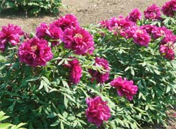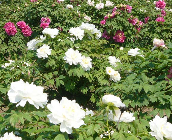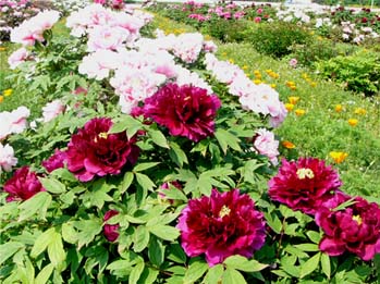 | 伊勢崎市境上矢島の「上武ぼたん園」、暑いくらいの行楽日和の4月29日、菜の花で覆われた早川サイクリングロードを利用して訪れました。 今年は昨年より1週間早く咲いたとのことで、一部散り始めていた株もありましたが、ご覧のようにまだまだ真っ盛り。 濃いピンク、薄いピンク、ビロード、紫、臙脂、深紅、クリムゾンレーキ・・・どんな色の言葉をもってしても表現できない目にも鮮やかなぼたんが畑一面に咲き誇っていました。 今年は花や野菜の直売用建物ができ、ぼたん畑の隣には黄色いポピーが植えられ、新たな楽しみも加わっています。 (2008/4/30 記) |