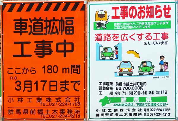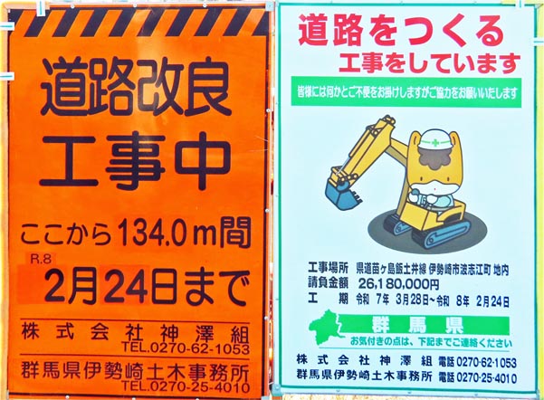 ■工事場所:伊勢崎市波志江町 地内 →工事区間図 ■発注部署:群馬県伊勢崎土木事務所 ■工期:令和7年(2025年)3月28日〜 ■工事延長:L=134m ■工事会社:株式会社 神澤組さん ![]() 現地に立つ工事看板。7/19と比べると、工期が延長されています。2026/1/17 ![]() 現地に立つ工事看板。5/11と比べると、請負金額が増額されています。2025/7/19 ![]() 現地に立つ工事看板 2025/5/11 |