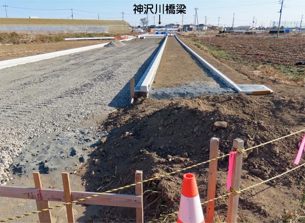工事経緯橋梁架設工事(上部工工事、下部工工事(A1橋台|A2橋台))(別ページが開きます)道路築造工事(前橋側(神沢川の西)|伊勢崎市側(神沢川の東)) 側溝布設と水路切り回し(伊勢崎側)| 起点側 道路改良工事 買収地管理(神沢川右岸)|畦畔(けいはん)設置・除草 |