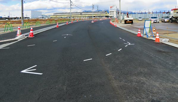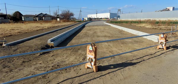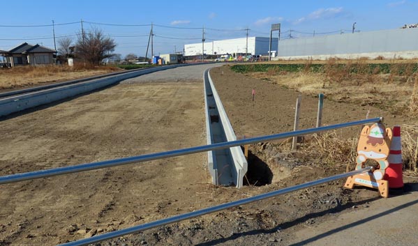 ・工区の東半分で下記工事が完了 ・両側の歩車道境界ブロック布設 ・東側歩車道境界には防護柵設置 ・車道は上層路盤工、歩道は路盤工 ・東側歩車道境界部は側溝布設 ・東側歩道外側に側溝布設 ・現道すり付け部に関して側溝布設、路盤工、雨水桝設置 工区西半分は基層路盤工(あるいは路床工)以降の工事は進んでいません。また東半分に関しても部分的な供用開始はありません。(2025/5/14 記) ![]() 工区中間部から東側(東側歩道と車道)2025/5/11 ![]() 工区中間部から東側(車道と西側歩道)2025/5/11 ![]() 現道から西方(上武道路方向)(西側歩道と車道)。右後方に赤城山。2025/5/11 ![]() 現道から西方(上武道路方向)(車道)。右後方に赤城山。2025/5/11 ![]() 現道から西方(上武道路方向)(車道と東側歩道)。右後方に赤城山。2025/5/11 ![]() 現道とのすり付け部(東側から西方)2025/5/11 |
