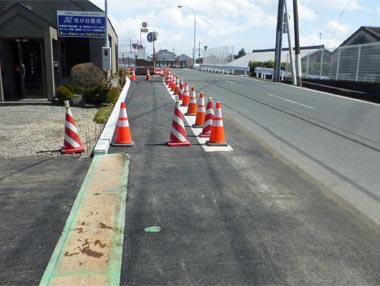 2019/3/31変更後工期の3月15日から2週間が経過した3月31日、現場では歩道の舗装工事を終えていましたが、ガードレールと防護柵の設置が未完でした。工期は再び延長され、4月30日に変更されていました。今回の工事では粕川に架かる宮前橋までは連続せず、手前で寸断されています。端部に地覆が施工されていたので、今後の工事で連続化するのか不明です。前回気になっていた、足影県道の路面高との高低差は、民地境界の縁石天端を道路縦断勾配に合わせ、その結果、歩道と車道が段差なくすり付いていました。(2019/4/15 記) |
