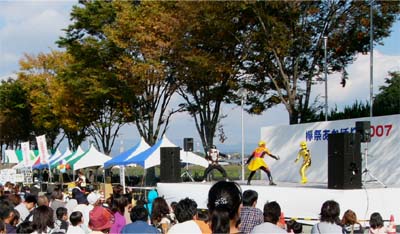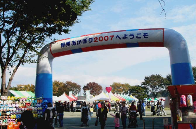 | 2007年11月4日、欅祭あかぼりと赤堀文化祭が赤堀コミュニティー広場と隣接施設で開催されました。 広場の周囲の大きな欅は茶褐色や橙色に色を染め、風もなく青空が広がる爽やかな一日、緑の芝生広場は大勢の人で賑わいました。(2007/11/5 記)。 |