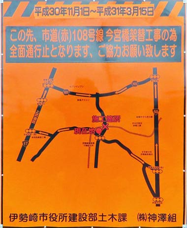 ![]() 桂川に架かる仮橋(右岸側から) 2019/1/4 ![]() 桂川西方の迂回路入口 2019/1/4 ![]() 桂川東方の迂回路・案内 2019/1/4 |