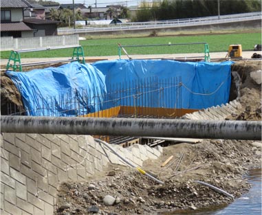 ![]() フーチングの配筋作業が進む右岸橋台 2019/3/13 |