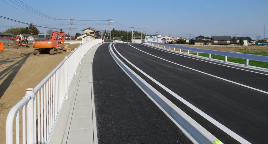 取り付け道路改良「今宮橋」を含む工事区間の道路線形は全て曲線区間。直線の一様勾配の道路に比べ、平面曲線と縦断勾配、横断勾配が付く複雑な線形区間です。車で通過すると十数秒で通過してしまいますが、走行性を重視した道路線形の陰に、工事会社さんの苦労が隠れています。通過時にはそんなことを思い出していただければ、工事関係者さんも報われることでしょう。 |